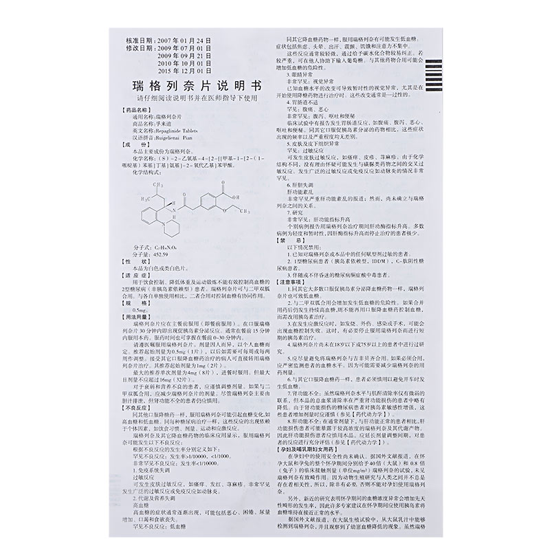1.妊娠期和哺乳期用药 尚未在怀孕期或哺乳期妇女中进行研究。因此怀孕期和哺乳期妇女禁用瑞格列奈片。 2.同其它大多数口服促胰岛素分泌降血糖药物一样,瑞格列奈片也可致低血糖。 3.与二甲双胍合用会增加发生低血糖的危险性。如果合并用药后仍发生持续高血糖,则不能再用口服降血糖药控制血糖,而需改用胰岛素治疗。 4.在发生应激反应时,如发烧、外伤、感染或手术,可能会出现高血糖。 5.瑞格列奈片尚未在肝功能不全的患者中进行过研究。也未在18岁以下或75岁以上的患者中进行过研究。 6.
