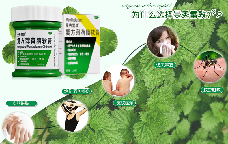 用于伤风感冒所致的鼻塞,昆虫叮咬,皮肤皲裂,轻度烧烫伤,擦伤、晒伤及皮肤瘙痒。